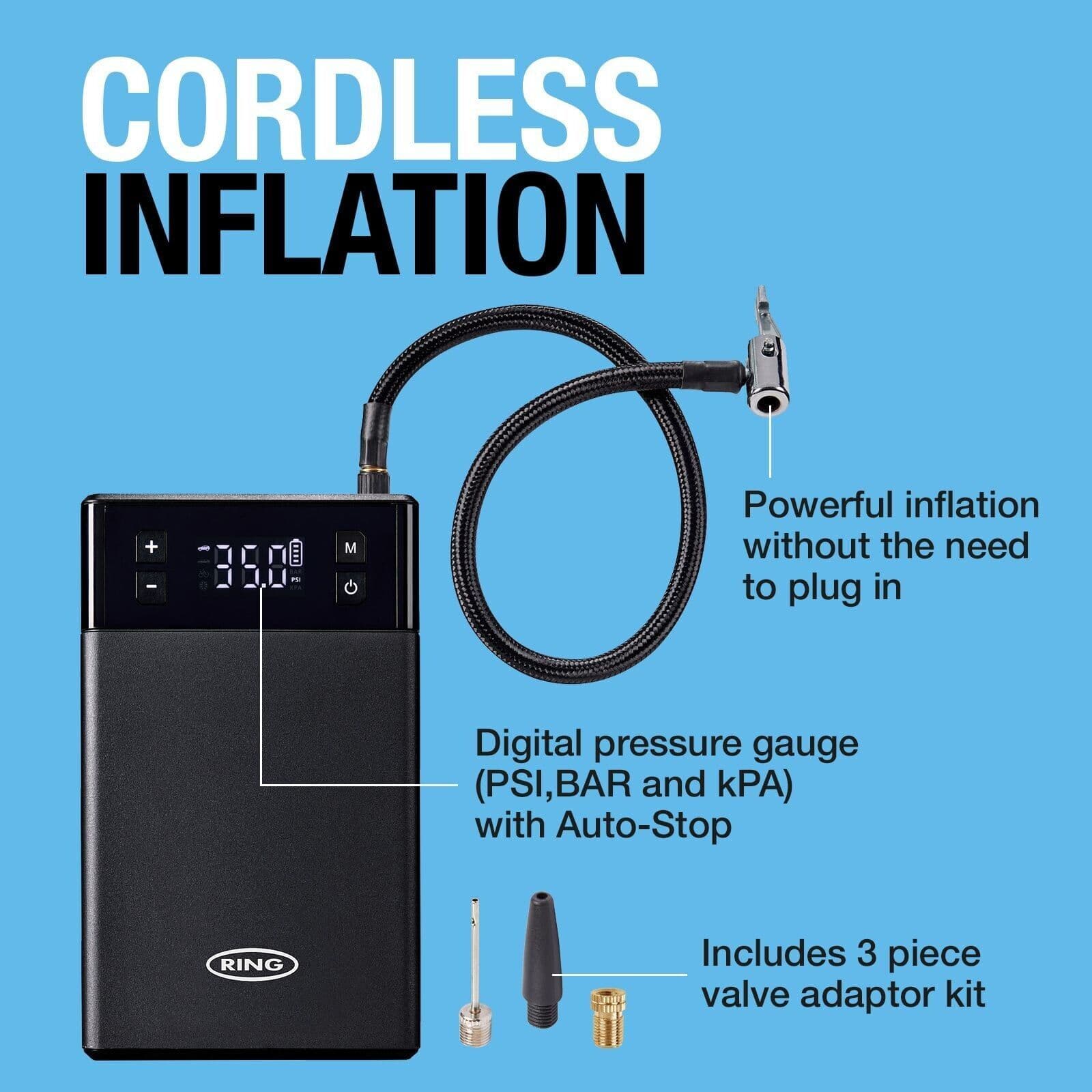 Cordless tyre inflator: Built-in inflator with a digital pressure gauge and auto stop function