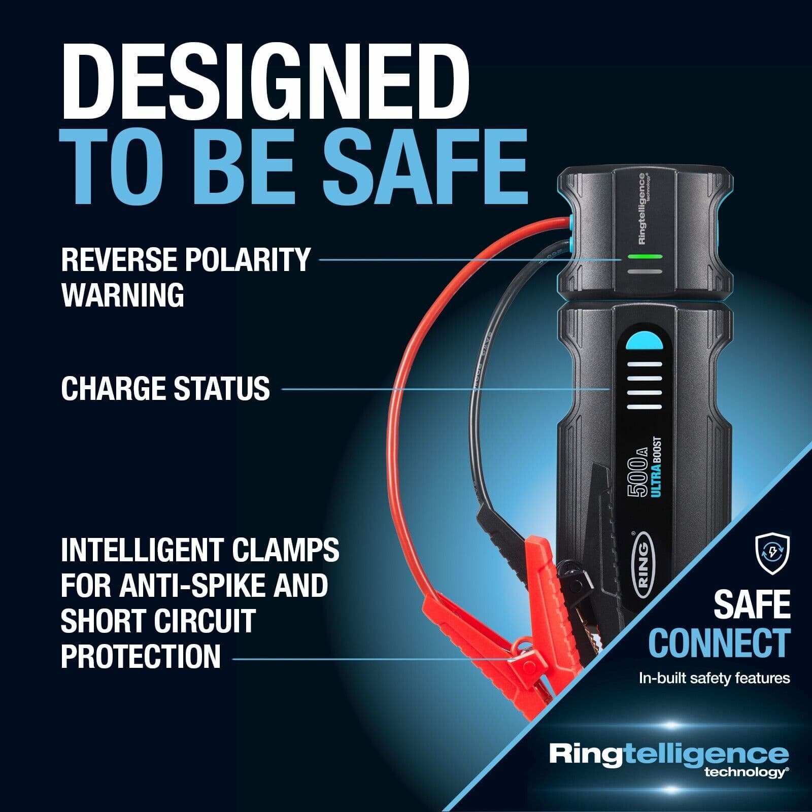 Safety is paramount, and with Ringtelligence technology, the ULTRABOOST 500A offers reverse polarity protection and a spark-free design, keeping you and your vehicle secure during usage. The Lock 'n' Load battery terminal ensures a secure and safe connection, while the easy-reach cables make it ideal for even large batteries.